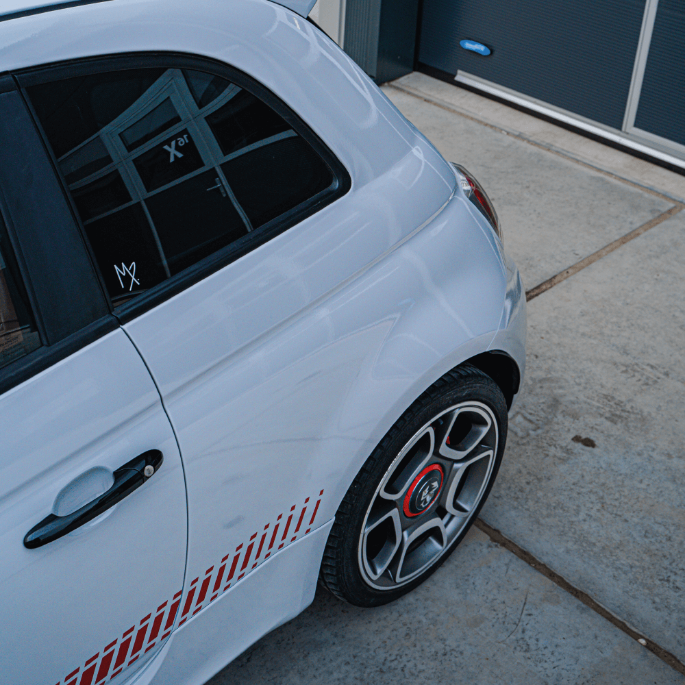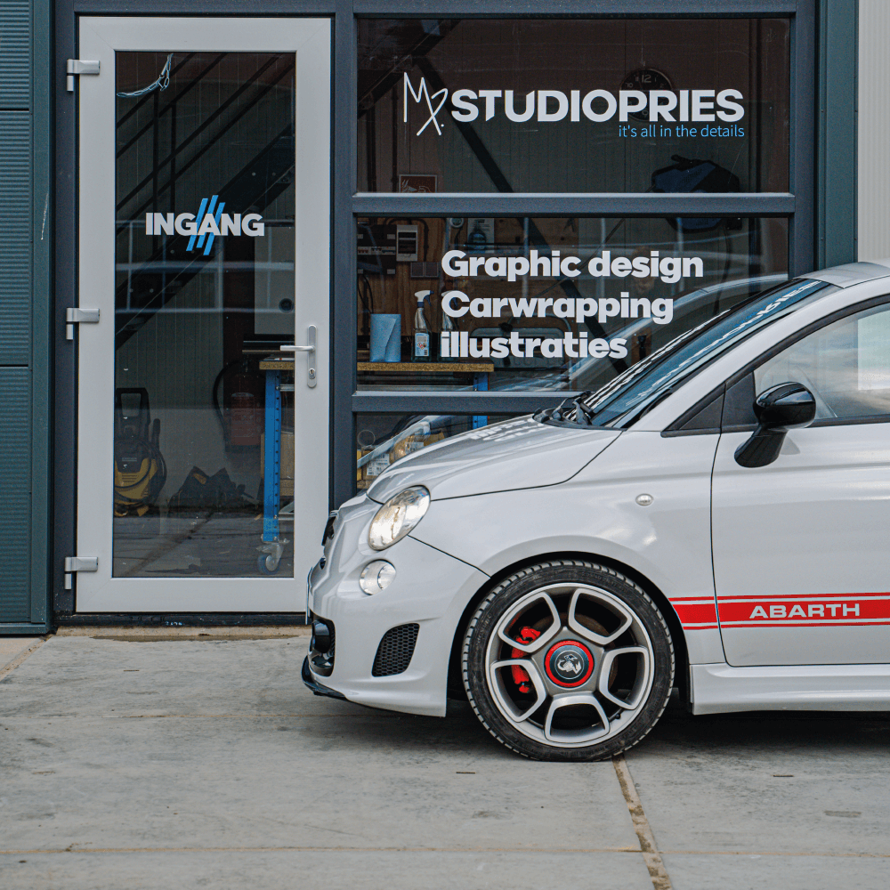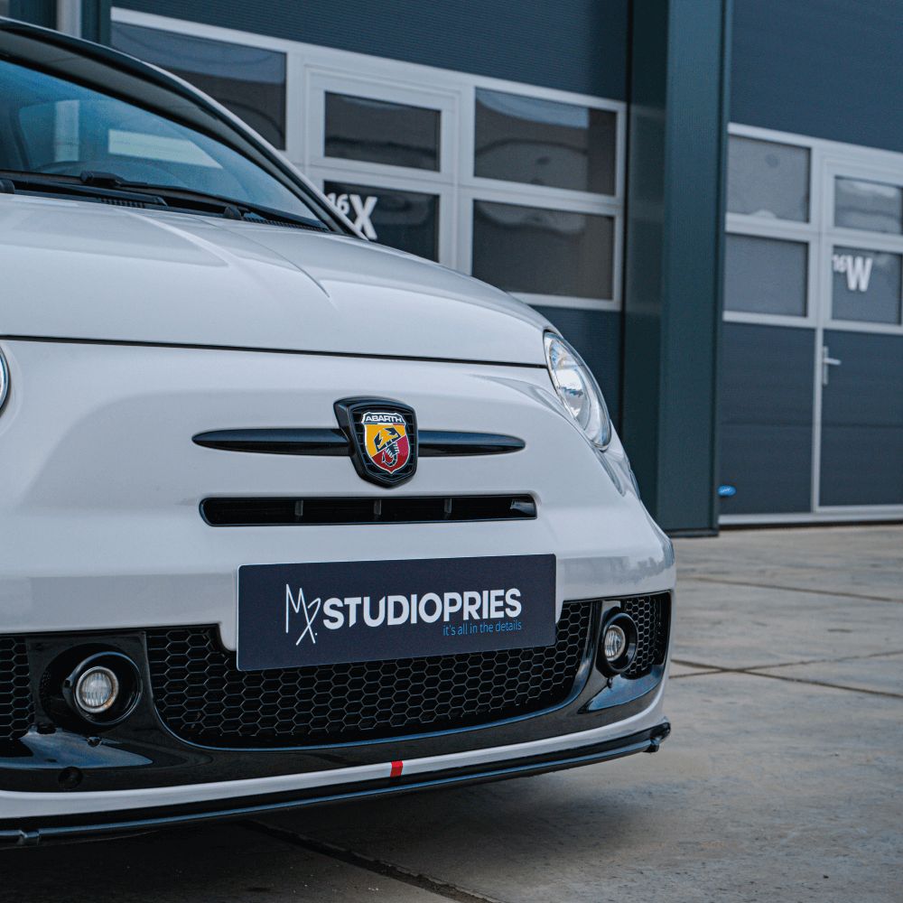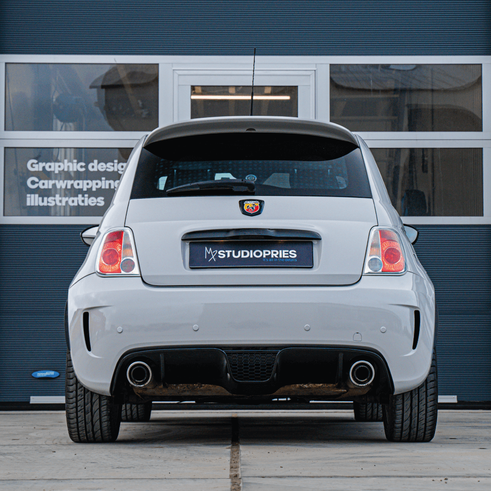 StudioPries heeft deze Abarth mogen wrappen voor autobedrijf Ennik. De auto is geplakt met de Storm grey van het merk 3M. Deze kleur komt aardig overeen met de “grigio cenere” en staat daarom ook perfect op de Abarth. Ook zijn de delen die chroom waren voorzien van een glanzend zwarte folie en is de originele striping op de zijkanten toegevoegd. Het eindresultaat is een hele strakke Abarth.